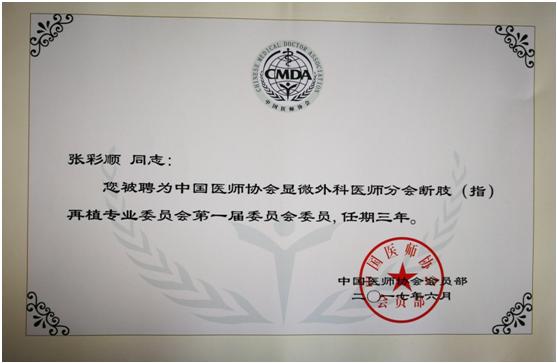 我院张彩顺主任当选中国医师协会显微外科医师分会断肢(指)再植专业委员会委员