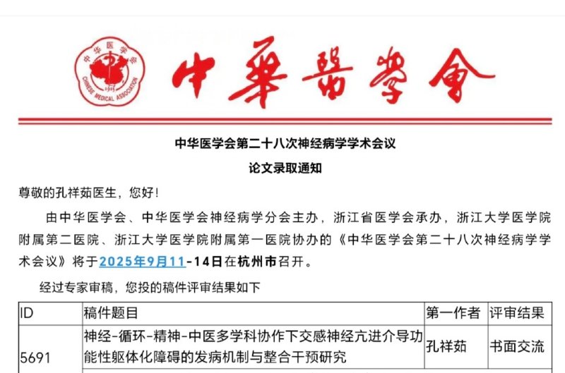 近日,由中华医学会、中华医学会神经病学分会主办的第二十八次神经病学学术会议隆重召开,我院神经内科牵头,联合循环、精神、中医等多学科团队共同开展的《神经-循环-精神-中医多学科协作下交感神经亢进介导功能性躯体化障碍的发病机制与整合干预研究》成功入选大会论文汇编,标志我院在跨学科整合医学及功能性疾病诊疗领域的突破与影响力。