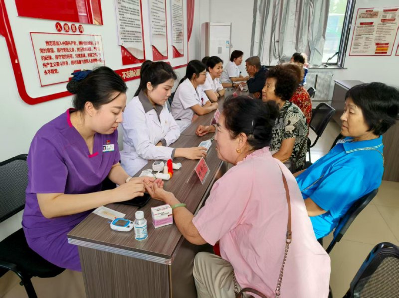 科普讲座结束后,由呼吸与危重症医学科、介入科、放疗科、肾脏内科等科室组成的多学科 “医护服务团”迅速到位,为居民提供全方位诊疗服务。李仲文主任、辛积华主任、张书丽副主任、黎明阳医生等人耐心接诊,详细询问病史、分析检查报告,针对慢性咳喘、下肢不适、慢性肾病、肿瘤康复等问题,逐一给出个性化诊疗建议;李杰护士长与护士连相、杨丹丹分工协作,免费为居民测量血压血糖,开展药物指导,确保用药安全;贺娜书记与杨雅丽护士长全程协调诊疗秩序,保障活动高效推进。
