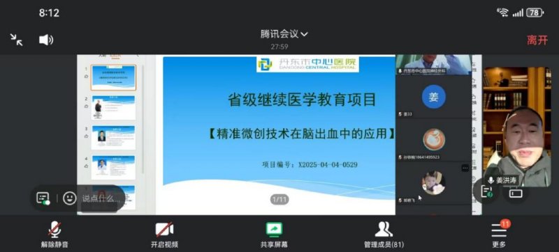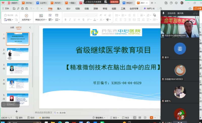 为聚焦精准微创技术前沿,引领区域脑出血诊疗高质量发展,进一步提升辽沈地区脑出血疾病整体诊治水平,11月22日,由丹东市医学会、丹东市脑损伤质控中心主办,我院承办的省级继续医学教育项目《精准微创技术在脑出血中的应用》暨脑损伤质控总结会在我院顺利召开。会议创新采用“线上+线下”融合模式,吸引省内外120余名神经外科领域专家学者、临床骨干参会,共同畅享一场兼具理论高度与实践价值的学术盛宴。
