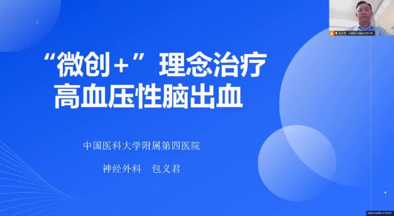 学术讲座环节聚焦核心议题,各专家依次分享研究成果与临床经验。中国医科大学附属第四医院包义君教授以《“微创+”理念治疗脑出血》为题作专题报告。我院董雷副院长解读《高血压脑出血多学科诊疗指南》。专题分享阶段,我院刘福超主任医师以《脑出血术后血压管理》为题交流经验,张茂彬主任医师围绕《神经内镜技术在高血压脑出血治疗中的应用》展开分享。