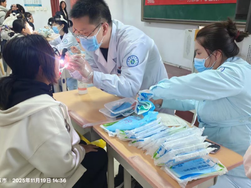 科普宣讲结束后,校园临时诊疗区迅速有序运转。党员医护团队为同学们提供免费口腔检查、龋齿筛查、牙周状况评估、正畸咨询及健康指导等全方位服务。医护人员耐心细致地为每一位咨询者检查口腔状况,详细记录牙齿问题,针对发现的龋齿、牙龈炎、牙列不齐、智齿阻生等情况,逐一制定个性化治疗建议,用专业与温情守护学子口腔健康。