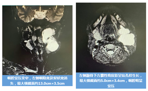 郭慧月医生查体及影像显示,肿物最大径13cm×5cm,上端抵硬腭、下端平喉入口,盘踞下颌骨深面,致咽腔变窄、左侧咽隐窝消失。更危急的是,肿物呈“钻孔样”缠绕颈总动脉、舌下神经等关键结构。颈部血管神经密集,稍有不慎即致大出血、面瘫甚至致命,手术难度堪称“雷区排爆”。