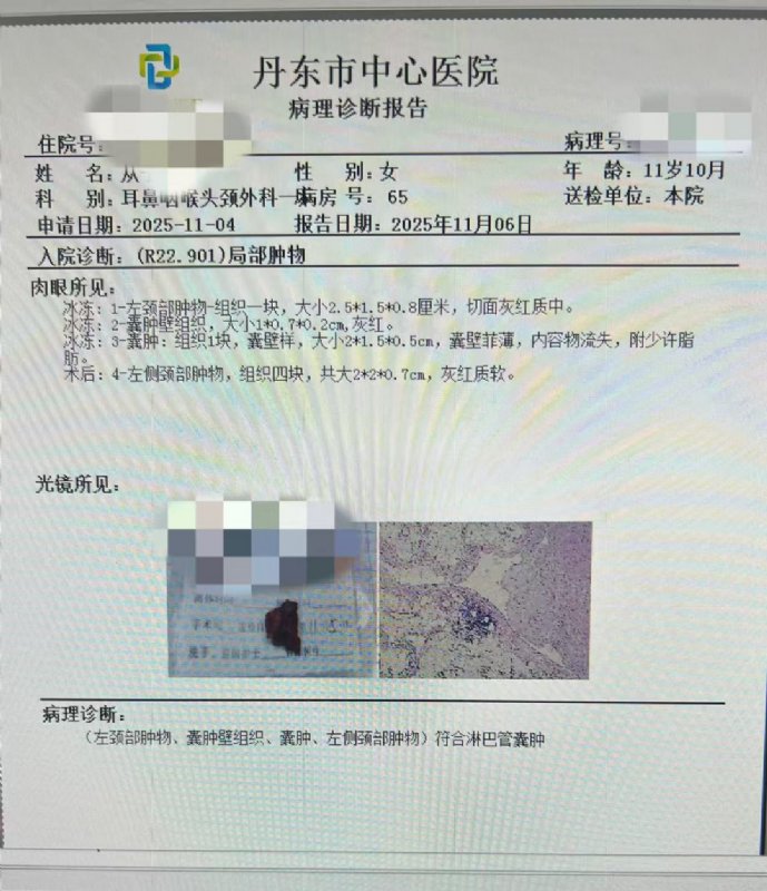 2025年10月末,11岁的从某被同学发现左侧颈部有包块。虽无痛痒,但短短几天肉眼可见增大,为求根治,家人带着孩子四处打听后,慕名来到我院。10月28日,经门诊详细检查后,患儿以“左颈部包块1周”收入院,一场与罕见病魔的较量就此拉开序幕。