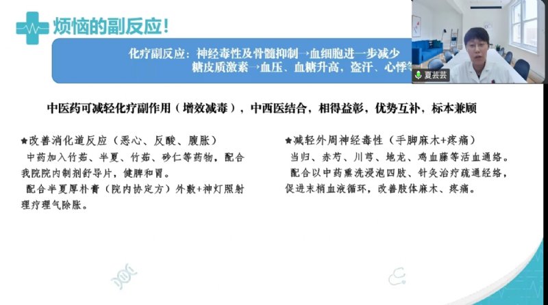 会上,辽宁中医药大学附属医院血液科副主任夏芸芸从中西医结合角度,系统讲解了多发性骨髓瘤基本知识,解读了中医疗法的重要价值。她提出,中医辨证论治可有效缓解西医治疗带来的恶心呕吐、周围神经病变等不良反应,增强患者免疫力,实现增效减毒、1+1>2的治疗效果。