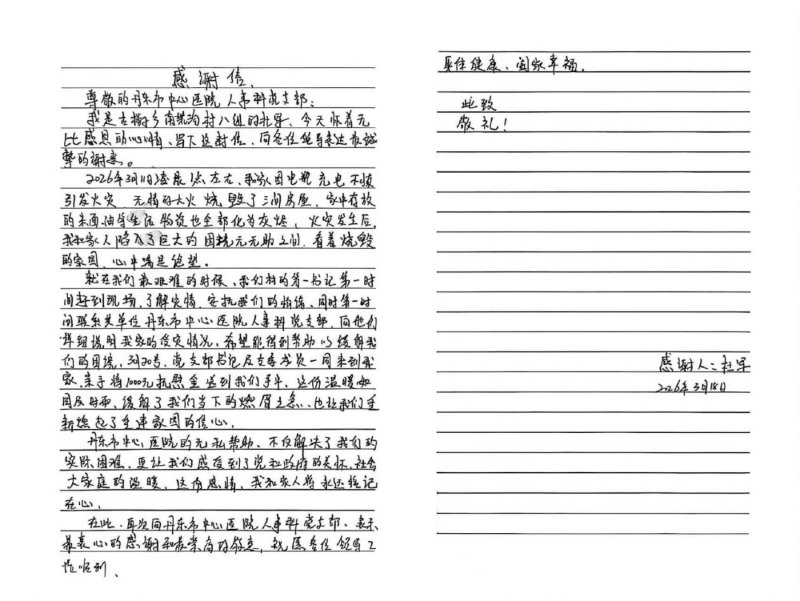随后,这份凝聚着支部全体党员爱心的善款被及时送到杜军手中,有效缓解了这个受灾家庭的燃眉之急,也让杜军一家人在困境中真切感受到了来自社会各界的关怀与温暖。“感谢丹东市中心医院人事科党支部的各位党员,在我们最困难、最绝望的时候向我们伸出援手,这份恩情我们永远铭记在心!”杜军及家人满怀感激,特意书写了一封感谢信,亲手送到支部党员手中,信中字里行间满是真挚的谢意,诉说着这份跨越距离的温暖情谊,也见证着人间大爱。
